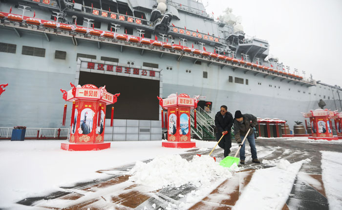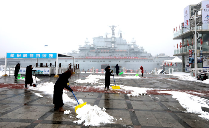 大家不顧嚴寒、齊心協力、配合默契,經過兩個多小時的努力,從景區16萬平米停車場到“基輔號”航母主干道上的積雪均清掃完畢,為游客營造出安全、有序的旅游環境,同時也彰顯出航母速度和航母力量。